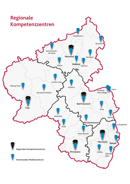 Die fünf Regionalen Kompetenzzentren mit den jeweils zugeordneten kommunalen Medienzentren sind in der Stabsstelle Digitales Kompetenzzentrum im Pädagogischen Landesinstitut verankert. Sie unterstützen Schulen, wie Schulträger bei der Implementierung von digitaler Ausstattung. Dabei liegt der Fokus auf dem technischen Support für Schulträger zur Umsetzung und Unterstützung der Schulen bei der Entwicklung pädagogisch-didaktischer Szenarien in der digitalen Welt. Durch die enge Verzahnung der unterschiedlichen Ebenen (Land-Region-Kommune) ist gewährleistet, dass zum einen landesweite Entwicklungen zeitnah aufgegriffen und gleichzeitig die regionalen Bedürfnisse berücksichtigt werden können.