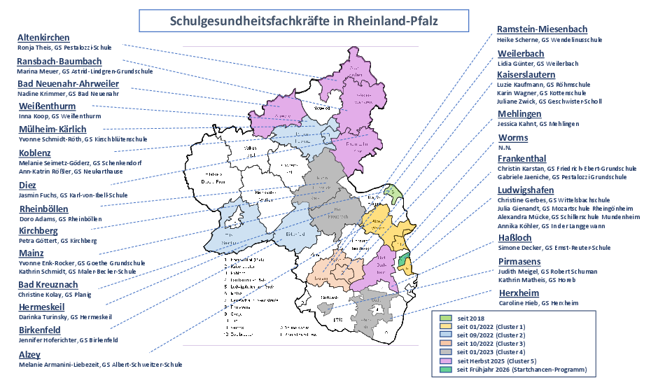 Seit 2023 erfolgt ein kontinuierlicher Ausbau. Aktuell sind in neun Regionen in Rheinland-Pfalz insgesamt 33 Schulgesundheitsfachkräfte an Grundschulen dauerhaft tätig.