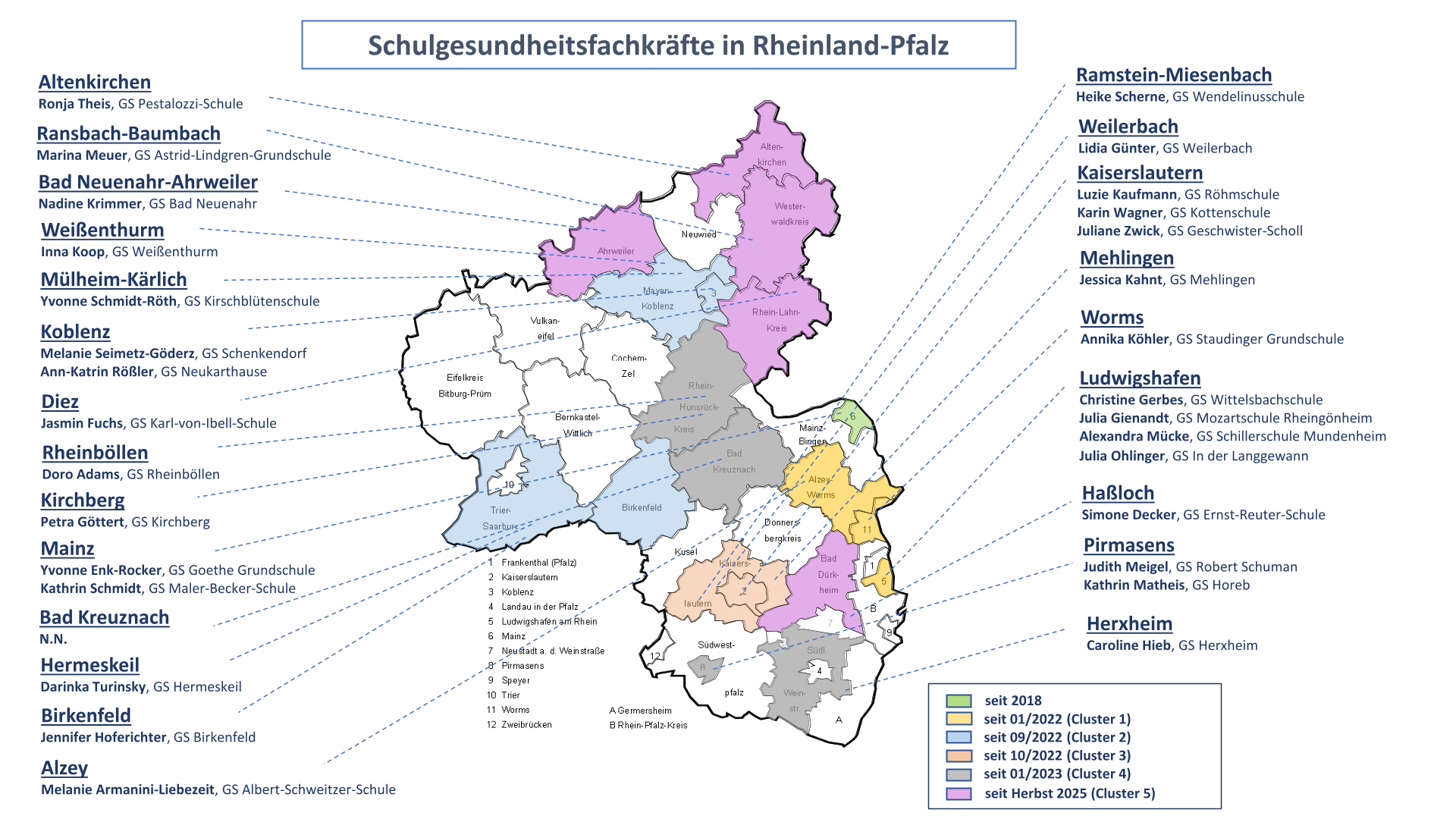Seit 2023 erfolgt ein kontinuierlicher Ausbau. Aktuell sind in neun Regionen in Rheinland-Pfalz insgesamt 31 Schulgesundheitsfachkräfte an Grundschulen dauerhaft tätig.