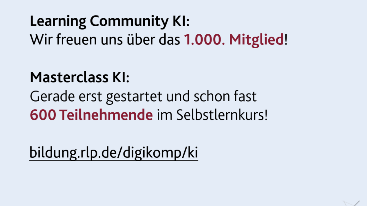 Für Rückfragen steht Ihnen das KI-Team des Pädagogischen Landesinstituts unter folgender Kontaktadresse zur Verfügung: Zukunftslabor.KI(at)pl.rlp.de