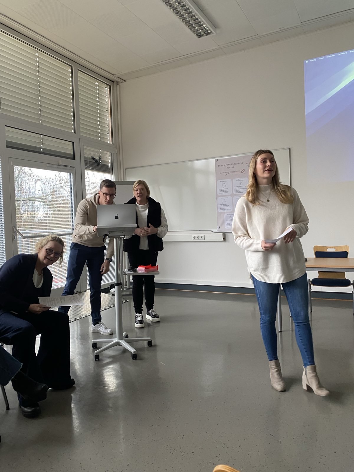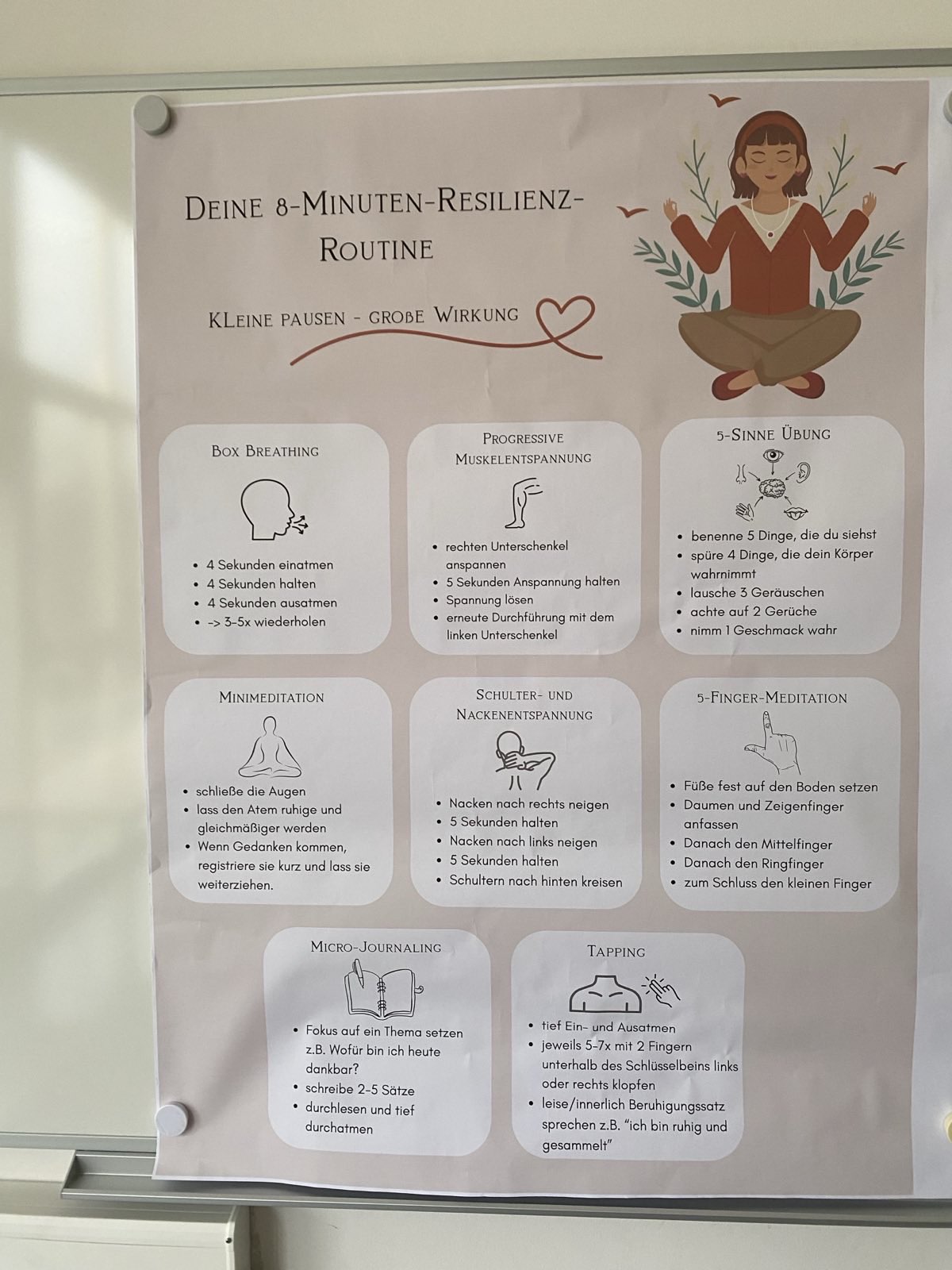 Das Projekt „Deine 8-Minuten-Resilienz-Routine“ hatte das Ziel, die Resilienz von Lehrkräf-ten im Schulalltag zu stärken. Die Projektgruppe entwickelte eine kurze Routine aus verschie-denen Achtsamkeits- und Entspannungsübungen, die sich problemlos in Pausen oder kurze Unterbrechungen integrieren lassen.