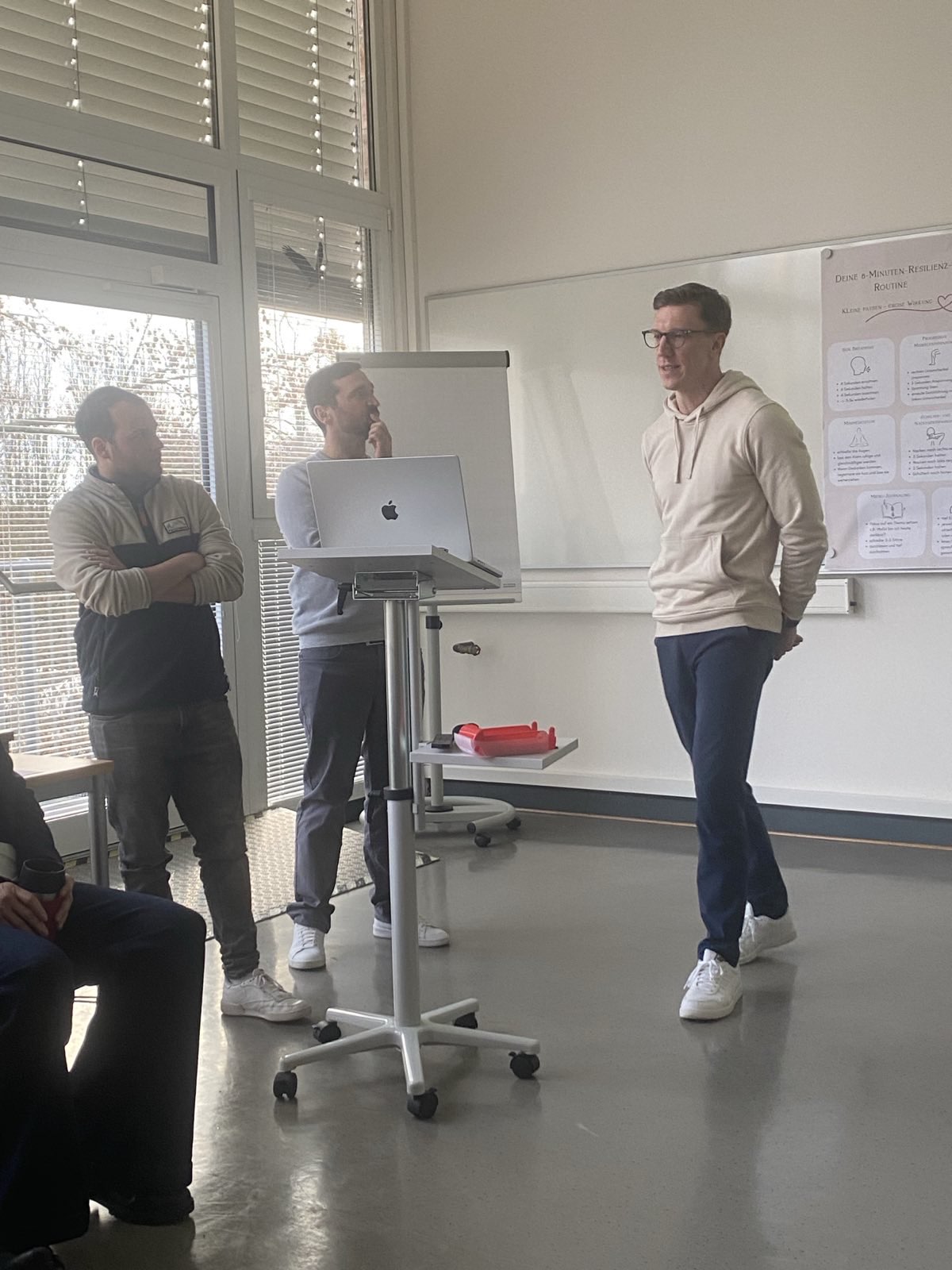 Die Übungen wurden sowohl vorgestellt als auch praktisch angeleitet durchgeführt, sodass die Teilnehmenden eigene Erfahrungen sammeln konnten. Die Rückmeldungen zur Akzeptanz und Umsetzbarkeit fielen insgesamt sehr positiv aus. Besonders hervorgehoben wurde, dass die kurzen Übungen ohne großen Zeitaufwand in den Alltag integriert werden können und dennoch eine spürbare Wirkung entfalten.