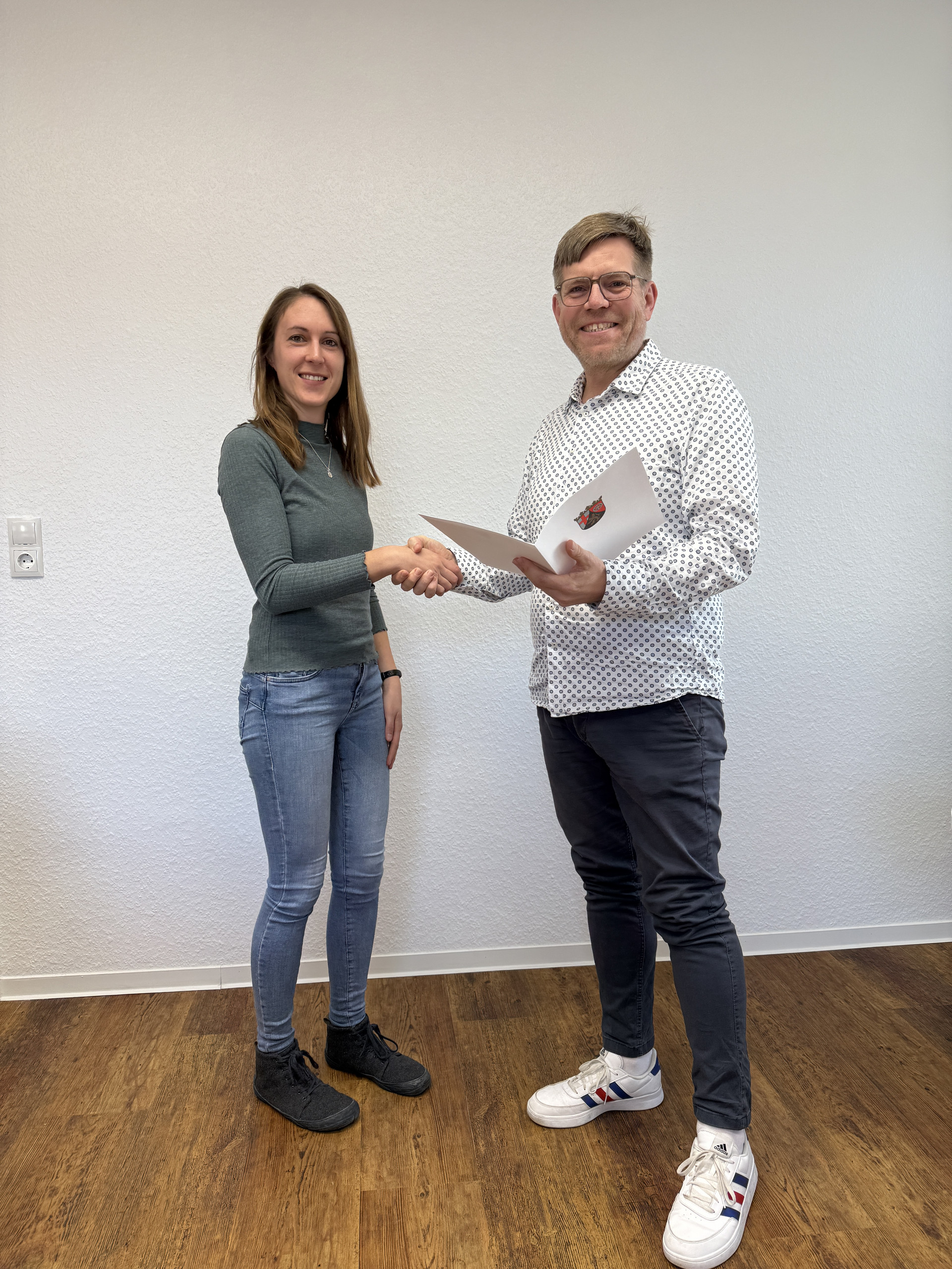 Unsere Kollegin Katharina Hermes-Regnier wurde zum 07.11.2025 zur hauptamtlichen Fachleiterin ernannt. Sie ist seit dem 01.08.2016 als lehrbeauftrage Fachleiterin für den Förderschwerpunkt ganzheitliche Entwicklung an der Teildienststelle Trier tätig gewesen und zum Sommer 2025 an die Stammdienststelle nach Neuwied versetzt worden. Nun konnte ihr der stellvertretende Leiter Christian Schönig erfreulicherweise die Urkunde des Ministers zur Ernennung überreichen. Wir gratulieren Katharina Hermes-Regnier herzlich und freuen uns auf viele weitere Jahre kollegiale und konstruktive Zusammenarbeit im Studienseminar.