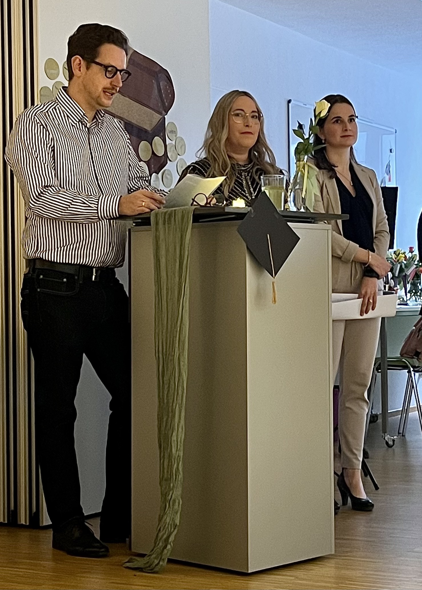 Gemeinsam mit den erweiterten Seminarleitungen Christina Stegemann, Carsten Simonis und Christina Kipp beglückwünscht Frau Conrad die Absolventinnen und Absolventen zu ihrem Erfolg und leitet schließlich zur Zeugnisvergabe des bestandenen Zweiten Staatsexamens über.