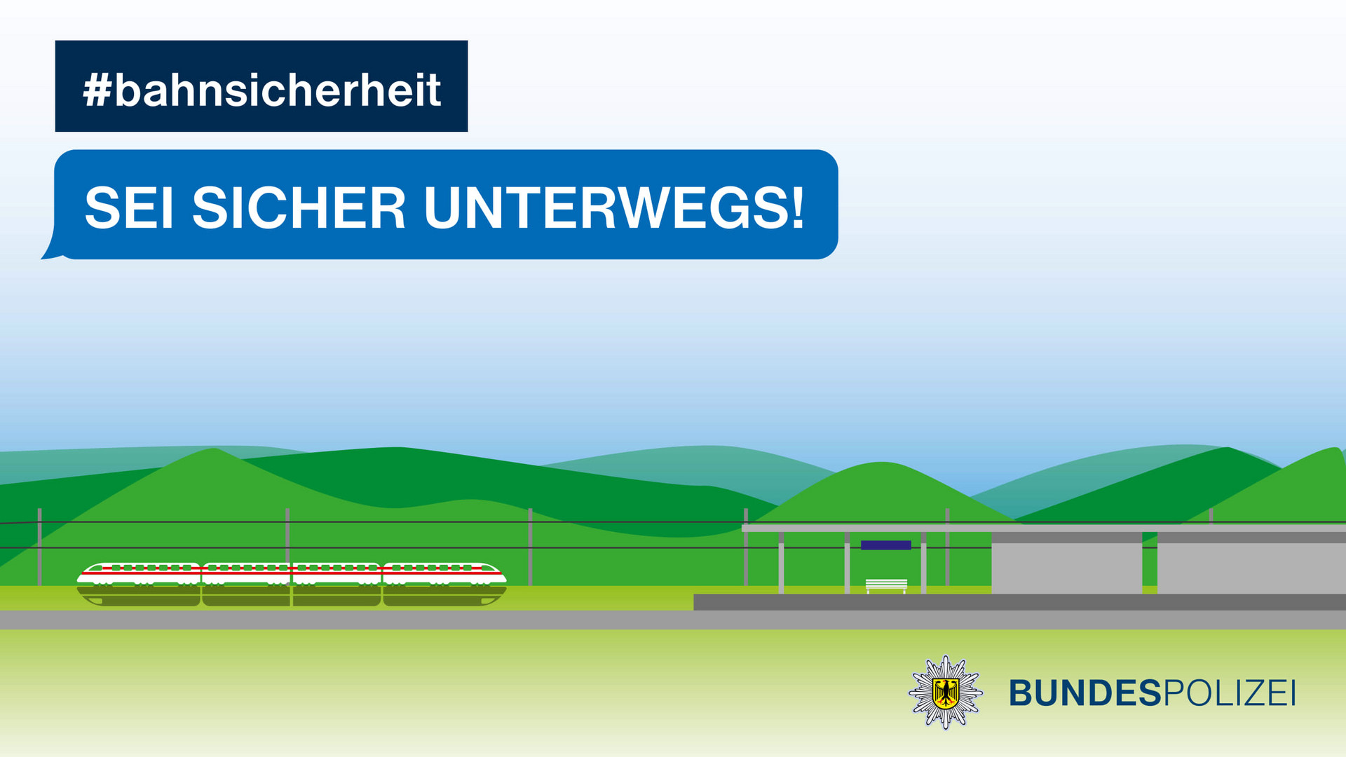 Die Bundespolizei informiert mit der Kampagne „Sei sicher unterwegs!“ über die Gefahren und die richtigen Verhaltensweisen auf Bahnanlagen. Die wichtigste Botschaft der Kampagne ist, dass das Betreten von Gleisanlagen – egal ob im Bahnhof oder auf freier Strecke – verboten ist. Nur an zugelassenen Übergängen ist es erlaubt und sicher!